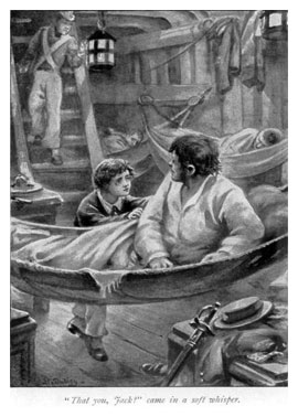 But at last the future powder monkey crept softly back into his old place and passed his arms round the rough sailor’s neck, and a curious thrill of satisfaction ran straight to Jack Jeens’ heart as he felt two little lips press his cheek, and heard a pleasant, soft voice whisper: